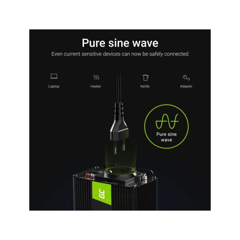 Kvalitní auto invertor Green Cell umožňuje napájení zařízení, která jsou vybavena běžnou elektrickou zástrčkou. Měnič se připojuje přímo na baterii (kabel je součástí), má teplotní ochranu a certifikáty CE a RoHS. Je vybaven chladicím systémem Turbo Cooling. Má vestavěný vypínač a LED kontrolky, které ukazují stav měniče. Je určen pro napájení notebooků, malých televizorů, světel, ventilátorů, různých zdrojů energie atd. Samostatně je k dispozici také 5V USB výstup. Měnič poskytuje čistou sinusovou křivku výstupního střídavého napětí, což umožňuje plynulý provoz i těch nejcitlivějších zařízení.